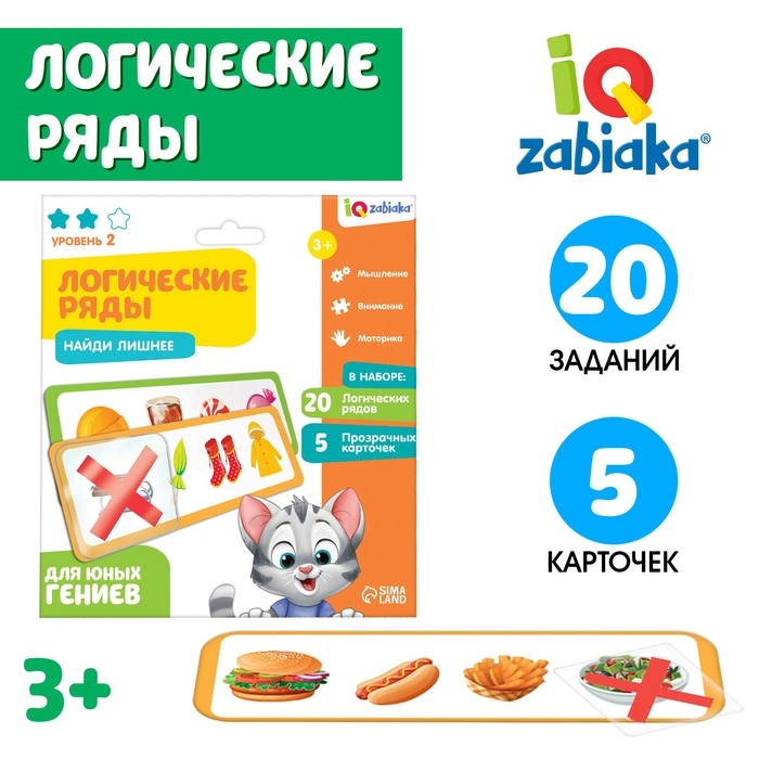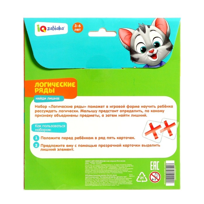 Развивающий набор «Логические ряды: Найди лишнее» создан для детей от 3 лет. С ним малыш будет учиться логически мыслить. В набор входит 20 заданий и 5 прозрачных карточек с крестиком.