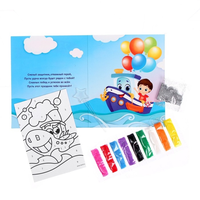Клеевая основа защищена специальным слоем бумаги, куда нанесены прорезные контуры. Каждый цвет находится в своей зоне: отделяйте верхний слой с помощью стеки, оформляйте элементы песком и добавляйте блёстки из набора.