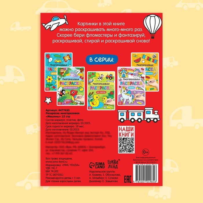 - В комплект входит 12 страниц с изображениями транспорта, а также 4 многоразовых маркера на водной основе с ластиком на колпачке. Так малыш сможет рисовать, стирать и снова раскрашивать картинки.