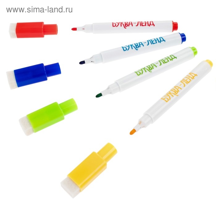 В наборе 4 разноцветных маркера на водной основе со стирателем на колпачке.
