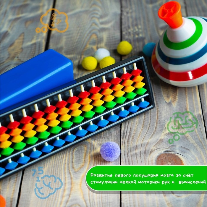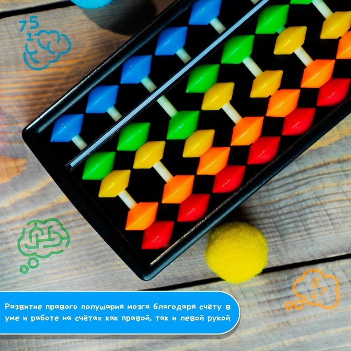 - Развитие левого полушария мозга за счёт стимуляции мелкой моторики рук и наглядного представления результатов вычислений.