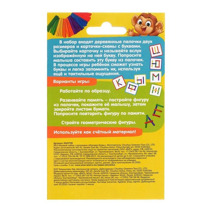 Обучающий набор «Изучаем буквы» подходит для малышей от 3 лет. Он включает деревянные палочки двух размеров и карточки-схемы с буквами. Палочки выполнены из натурального дерева, приятны на ощупь и абсолютно безопасны для ребёнка.