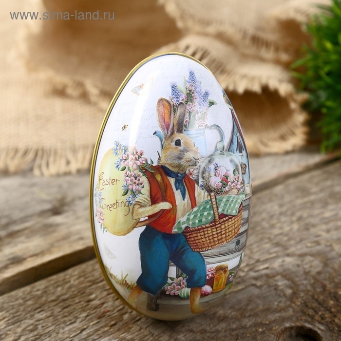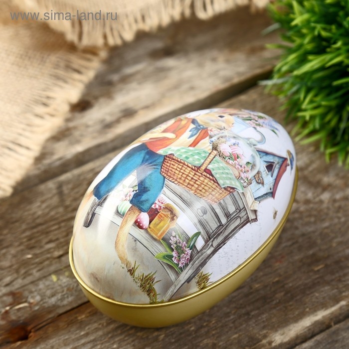 Шкатулка металл яйцо "Заяц с корзиной" 11х6,5х7 см