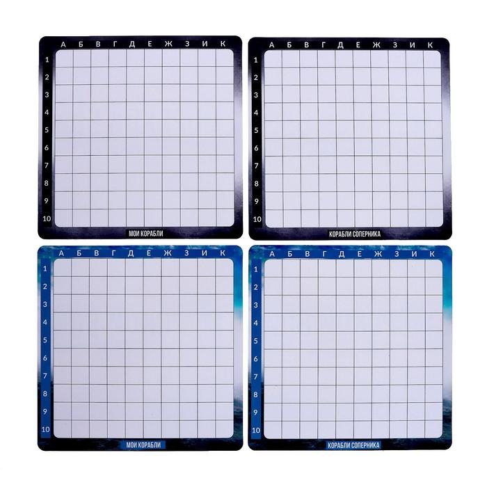 Корабли выделяются чёрным маркером на поле с подставкой. Каждый из игроков предполагает координаты их нахождения у соперника. При успешном попадании на карточке необходимо отмечать свою маленькую победу жетоном, а при поражении – крестиком красным маркером.