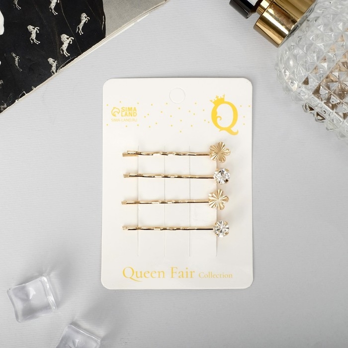 Невидимка для волос "Кварта" 5 см (набор 4 шт) цветочки страза, золото