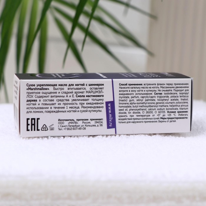 При ежедневном использовании масла в течение 1 месяца кутикула становится тонкой и мягкой, надолго приобретает ухоженный, здоровый, опрятный вид. Сладкий аромат «воздушного» лакомства Маршмэллоу доставит дополнительное удовольствие в процессе ухода за руками. Флакон масла укомплектован пипеткой, позволяющей точно и экономично наносить и расходовать продукт.
