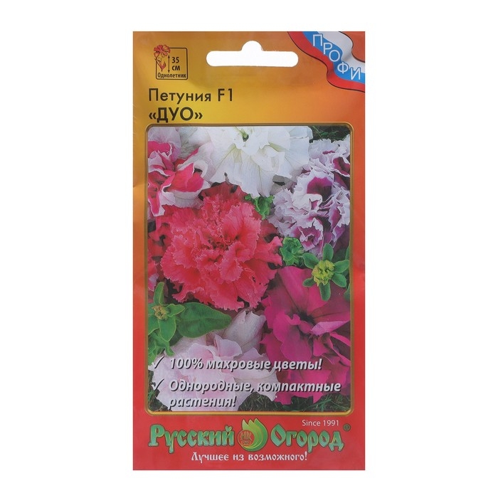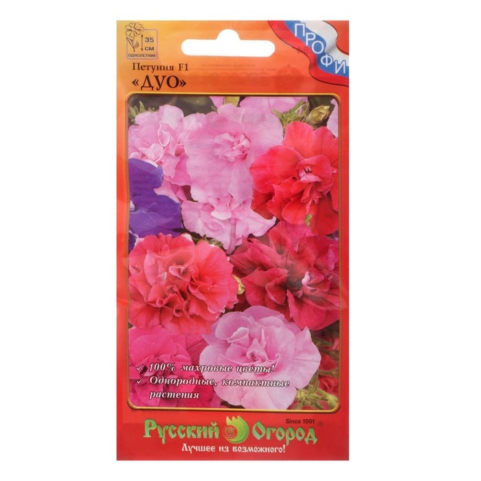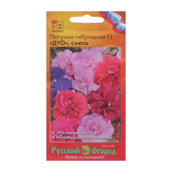 Петуния F1 Дуо, смесь – яркая смесь махровой петунии из коллекции Дуо. Эти ветвистые, не занимающие много места растения с достоинством выдерживают плохие погодные условия. При этом зацветает такая петуния очень рано. В предлагаемый набор петуний входят цветы белоснежной, ярко-малиновой, фиолетовой и другой окраски, что вместе создаёт оригинальные, приятные композиции с ноткой настоящего праздника лета.