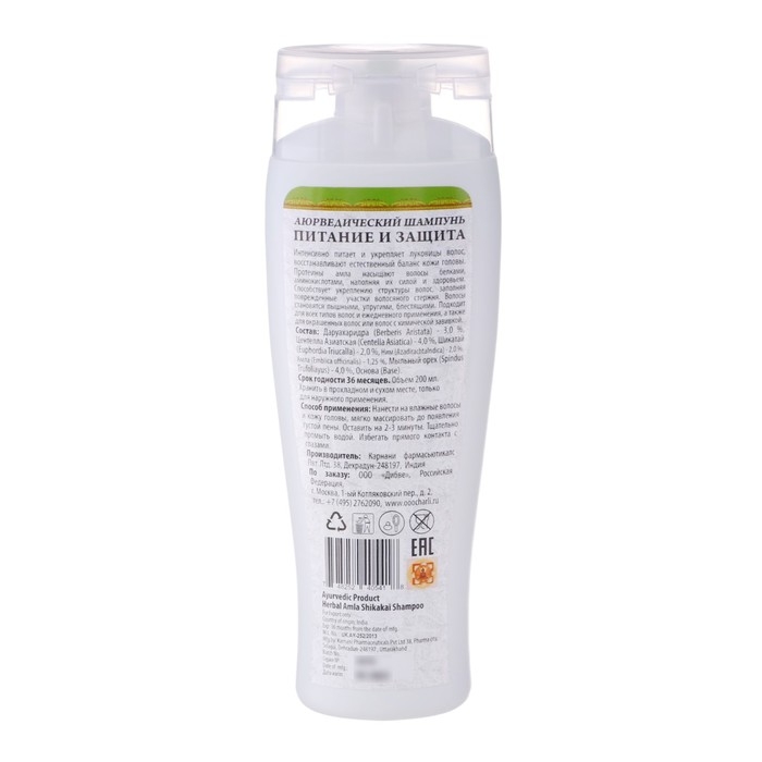 Состав: Тулси- 3%, Центелла азиатская - 4%, Ним - 2,0%, Шикакай 2%, Амла(emblica officinalis)- 2,5%., Мыльный орех 4%, Вода, Основа шампуня.
