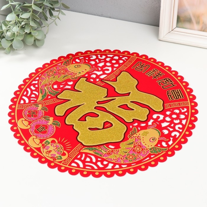 Салфетка денежная 34х34 см круглая "Два карпа - иероглиф Счастье" блёстки
