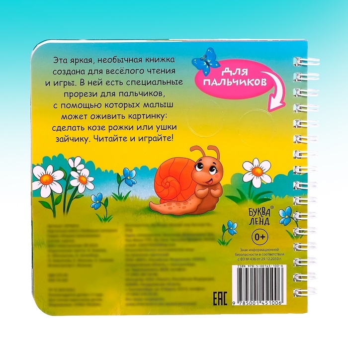 - В ней есть специальные прорези для пальчиков, с помощью которых малыш может оживить картинку: сделать козе рожки или ушки зайчику, и развить координацию движений и мелкую моторику рук.