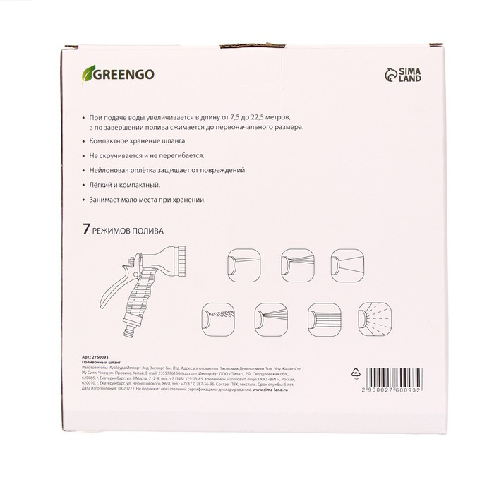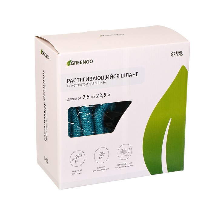 Шланг поливочный растягивающийся от 7,5 до 22,5 м, латекс, быстросъёмный, с поливочным пистолетом и штуцером, Greengo
