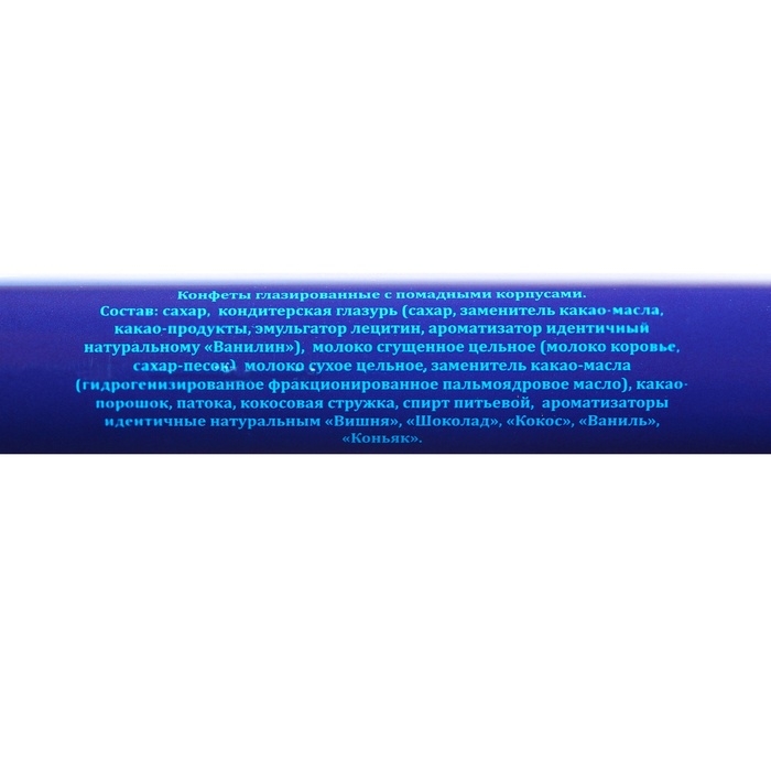Состав: сахар, кондитерская глазурь (сахар, заменитель какао-масла, какао-продукты, эмульгатор лецитин, ароматизатор идентичный натуральному «Ванилин»), молоко сгущённое цельное (молоко коровье, сахар-песок), молоко сухое цельное, заменитель какао-масла (гидрогенизированное фракционированное пальмоядровое масло), какао-порошок, патока, кокосовая стружка, спирт питьевой, ароматизаторы идентичные натуральным «вишня», «шоколад», «кокос», «ваниль», «коньяк».Энергетическая ценность в 100 г продукта – 1980 кДж / 470 ккал. Пищевая ценность (средние значения) 100 г продукта: белки – 6,0 г, жиры – 22 г, углеводы – 68 г.
