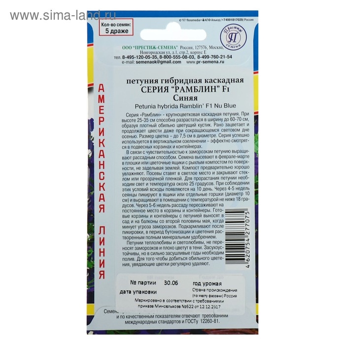Семена цветов Петуния гибридная "Рамблин Синяя" F1, 5 др