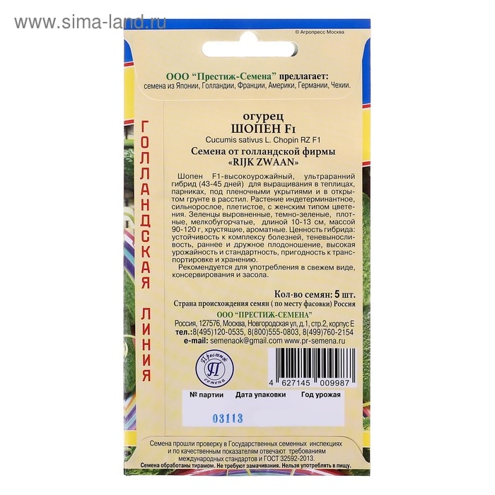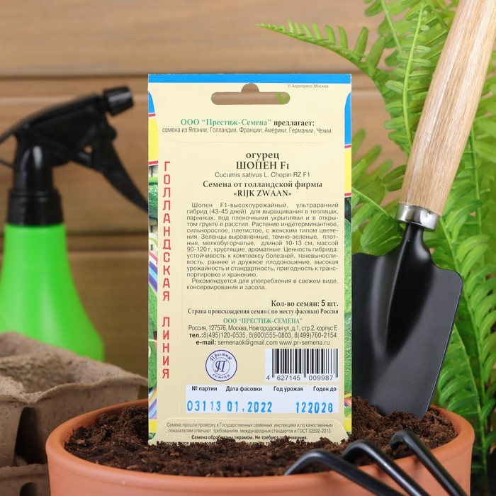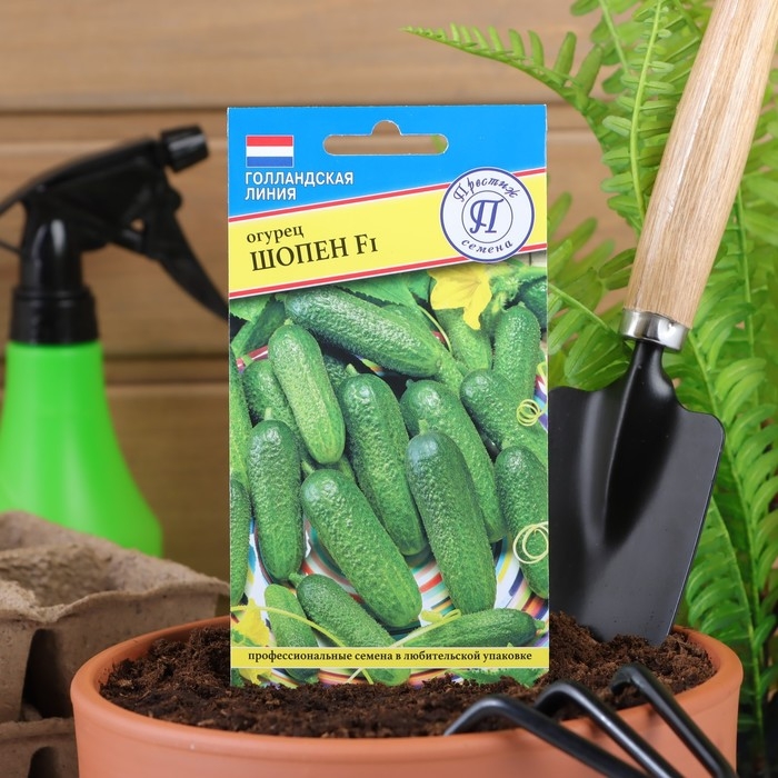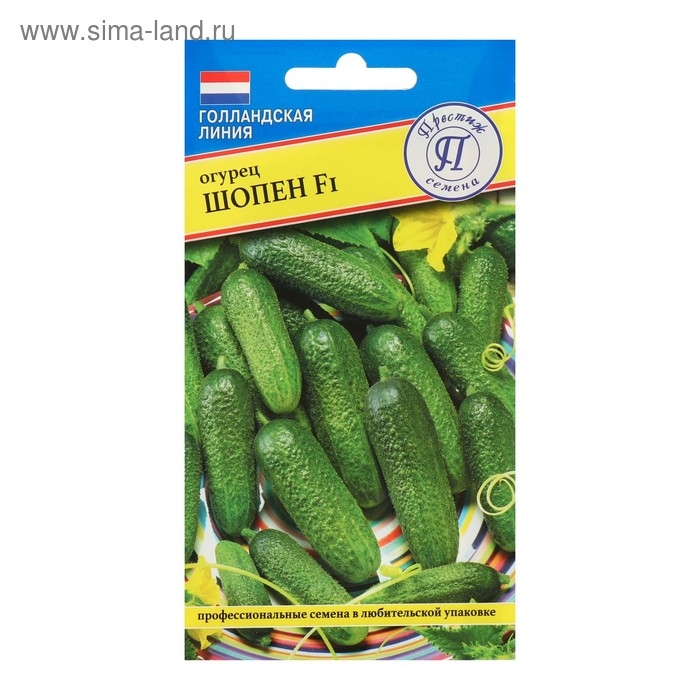 Шопен F1-высокоурожайный, ультраранний гибрид (43-45 дней) для выращивания в теплицах, парниках, под пленочными укрытиями и в открытом грунте в расстил. Растение индетерминантное, сильнорослое, плетистое, с женским типом цветения. Зеленцы выровненные, темно-зеленые, плотные, мелкобугорчатые, длиной 10-13 см, массой 90-120 г, хрустящие, ароматные. Ценность гибрида: устойчивость к комплексу болезней, теневыносливость, раннее и дружное плодоношение, высокая урожайность и стандартность, пригодность к транспортировке и хранению. Рекомендуется для употребления в свежем виде, консервирования и засола.