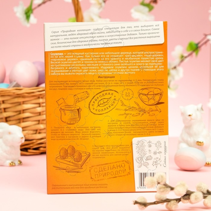 Природная Коллекция - это натуральные красители без химии и искусственных добавок, предназначенные для декоративного окрашивания пасхальных яиц. В их основе - сушеные растения, измельченные в порошок. Черная морковь окрашивает яйца в красивые сине-голубые оттенки, крапива и укроп - в оттенки цвета хаки, листья скумпии - в природный коричневый цвет, лепестки сафлоры - в желтый.