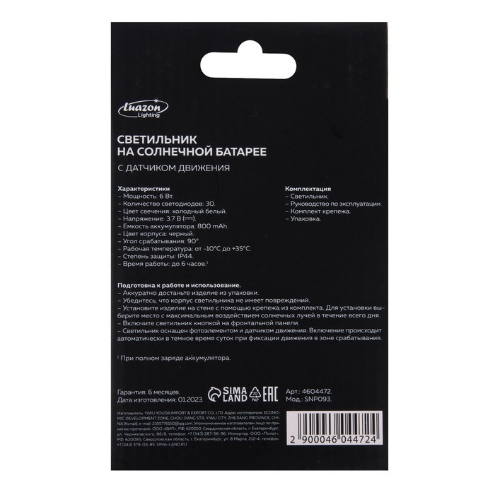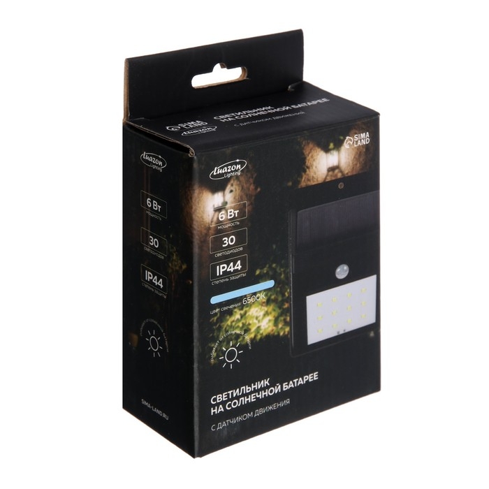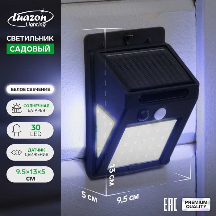 Садовый светильник на солнечной батарее с датчиком движения, накладной, 9.5 × 13 × 5 см, 30 LED, свечение белое