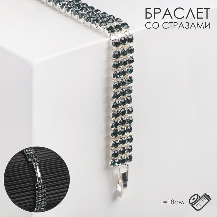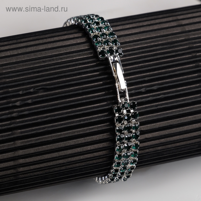 Браслет со стразами «Сияй» три ряда, цвет тёмно-зелёный в серебре, 18 см