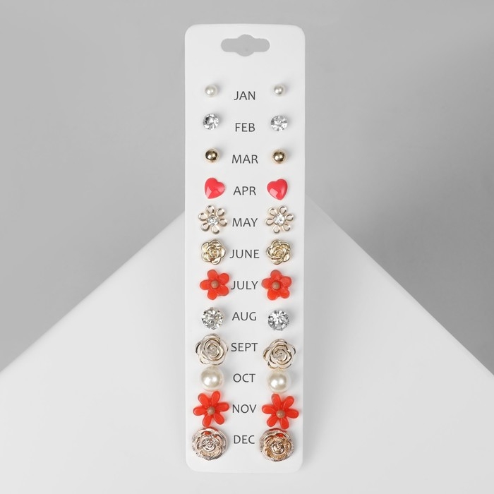 Пусеты 12 пар One year, цветочное ассорти, цвет бело-розовый в золоте
