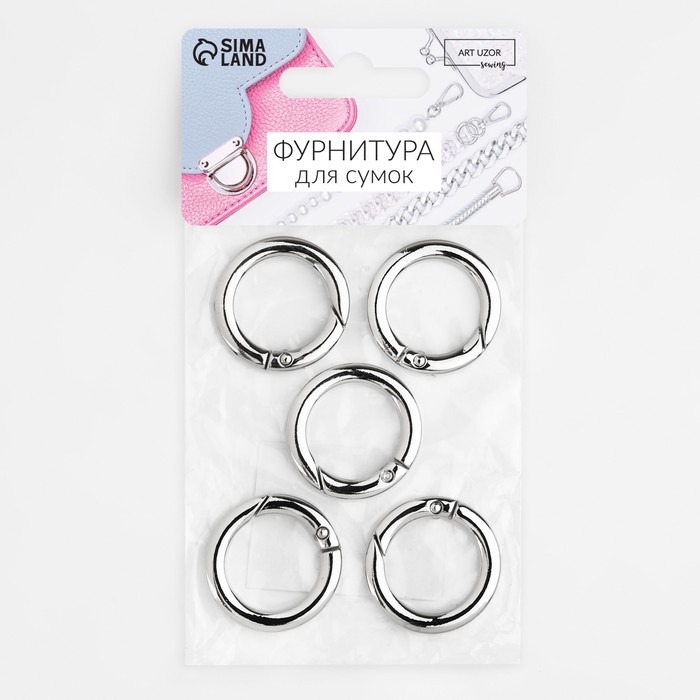 Кольцо-карабин плоский, d = 20/28 мм, толщина - 4 мм, 5 шт, цвет серебряный