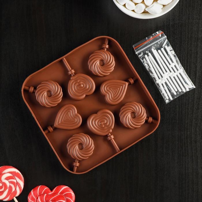 Форма для леденцов Доляна «Поцелуй», силикон, 24×9,4×1,5 см, 6 ячеек (4×2,4 см), с палочками, цвет коричневый