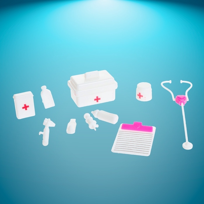 В комплекте представлены медицинские инструменты: фонендоскоп для прослушивания шумов, шприц, неврологический молоточек и другие аксессуары. Ребенок сделает осмотр игрушек, поставит диагноз и выпишет лекарства.