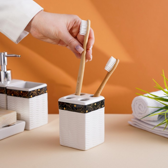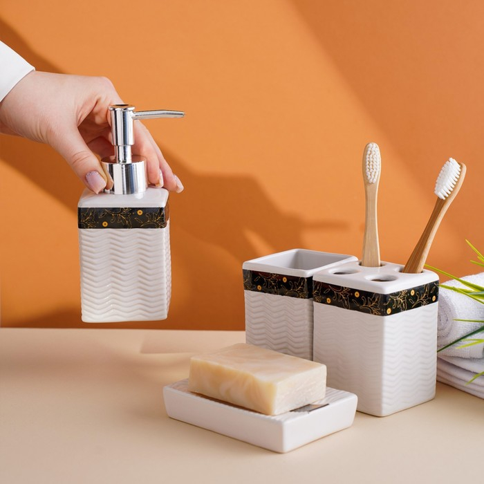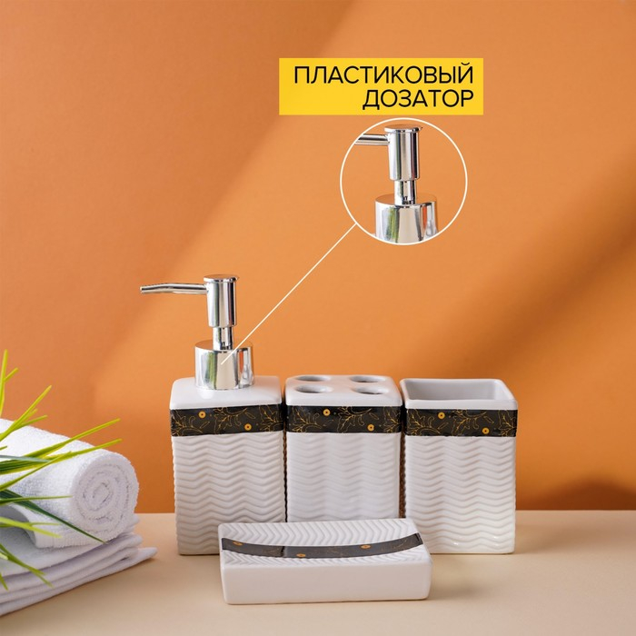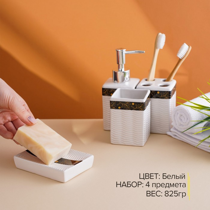 Набор аксессуаров для ванной комнаты «Золотой лист», 4 предмета (дозатор 250 мл, мыльница, 2 стакана), цвет белый