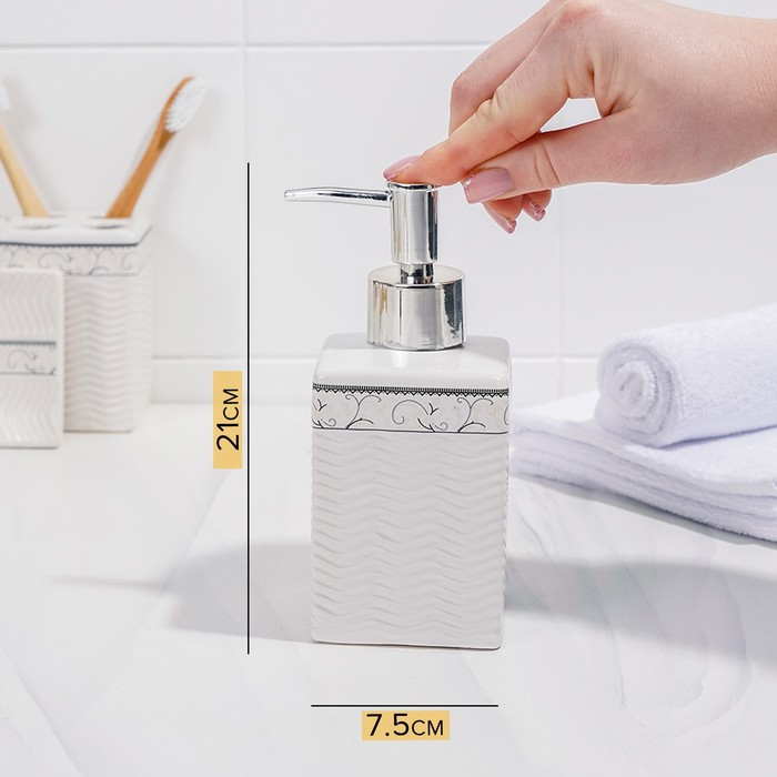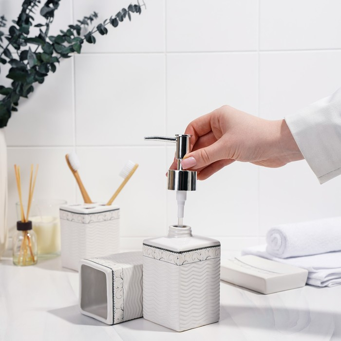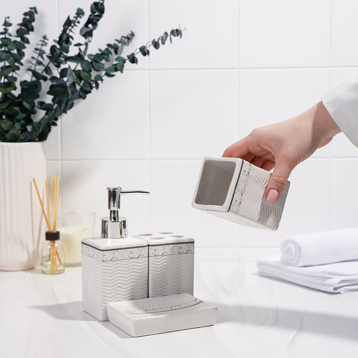 Аксессуары для ванной Доляна «Цветочный барельеф», 4 предмета, дозатор 270 мл, мыльница, 2 стакана 210 мл, белые