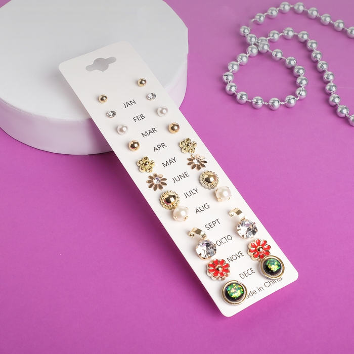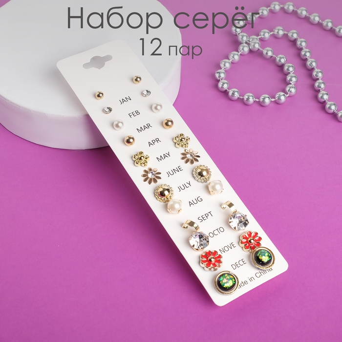Пусеты 12 пар One year, классика, цвет белый в серебре