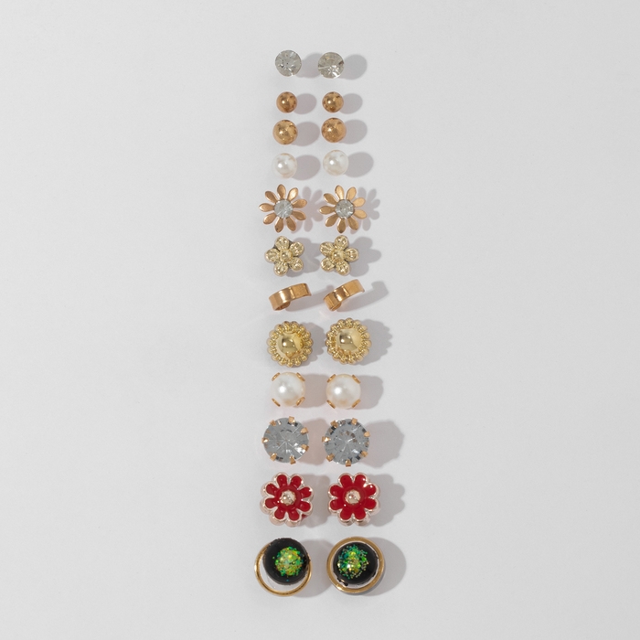 Пусеты 12 пар One year, цветочное ассорти, цвет бело-розовый в золоте