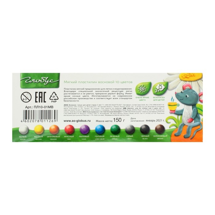 Пластилин выпускается по 6, 10, 12 цветов. В набор входит стек.