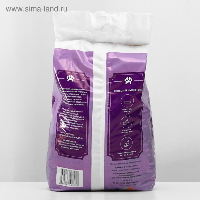 Наполнитель минеральный впитывающий "Дай лапку"- это специальный минеральный впитывающий материал, который используется для обеспечения комфортных условий гигиены и ухода за домашними питомцами. Он представляет собой смесь различных природных компонентов, которые способны впитывать жидкость и запахи, обеспечивая свежесть и чистоту в месте обитания животного.- "Дай лапку" обладает отличной впитывающей способностью благодаря своей минеральной основе. Это значит, что он быстро и эффективно впитывает жидкость, предотвращая появление неприятного запаха.- Фракция 6-10 делает этот наполнитель идеальным выбором для кошачьего туалета. Его крупные гранулы не только прекрасно впитывают влагу, но и предотвращают распространение мусора по всему дому.- "Дай лапку" очень экономичен в использовании. Благодаря своей высокой впитывающей способности, этот наполнитель длительное время остается сухим, что означает, что вам не придется менять его так часто, как другие виды наполнителей.- Гранулы не имеют острых краёв и не способны поранить животных или доставить им неудобства при пользовании туалетом;- При намокании гранулы наполнителя незначительно увеличиваются в объёме, но при этом полностью сохраняют форму и не прилипают к шерсти животных;- Не содержит вредных химических ароматизаторов, красителей, каких-либо канцерогенов, аллергенов как для людей, так и для кошек, является экологически чистым продуктом.Способ применения:1. Насыпать наполнитель в лоток слоем 5 см.2. Регулярно удалять экскременты и равномерно перемешивать кристаллы в лотке.3. Примерно через 4 недели удалите использованные гранулы и замените их новой порцией наполнителя.