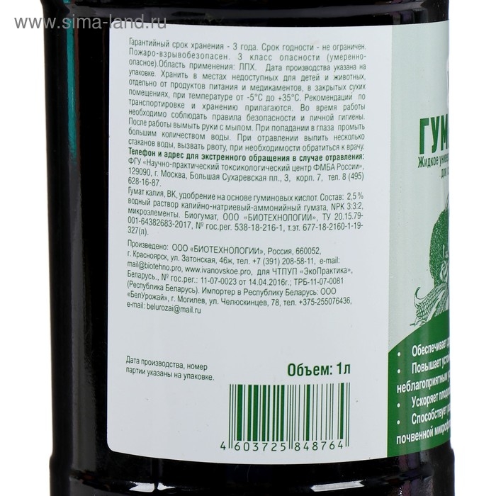 Органическое удобрение Гумат калия, Ивановское, 1 л