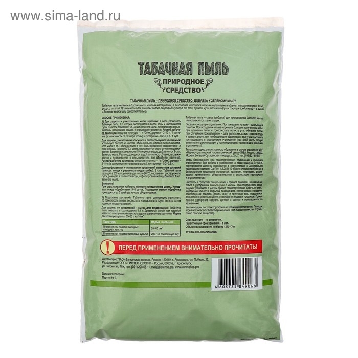 Биологически чистое средство, используемое в виде природного инсектицида для борьбы с различными паразитами. С ее помощью можно быстро избавить свой огород или сад от множества вредоносных насекомых вроде тли, мошки, плодовой моли, трипсов, слизней и пр. Табачную пыль можно использовать для обработки плодовых, ягодных и цветочных культур. Помимо того, что табачная пыль экологически чистое средство от паразитов растений, она может использоваться и в качестве органического удобрения. Она улучшает питание растений, активизирует работу микроорганизмов в почве и восполняет дефицит важных микроэлементов.