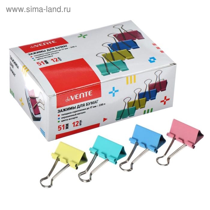 Зажимы для бумаг 51 мм, 12 штук, deVENTE, металлические, МИКС х 4 цвета, картонная коробка