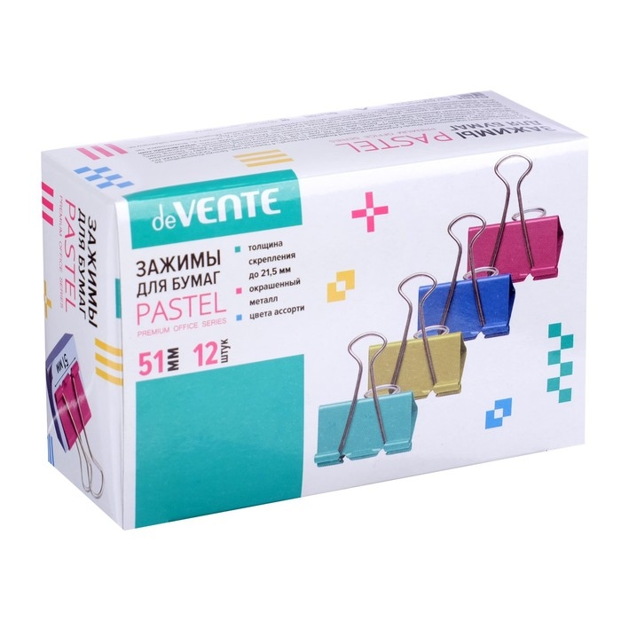 Зажим для бумаг deVENTE. Pastel металлический (51 мм) толщина скрепления до 21,5 мм, цветной ассорти, 12 штуки в картонной коробке