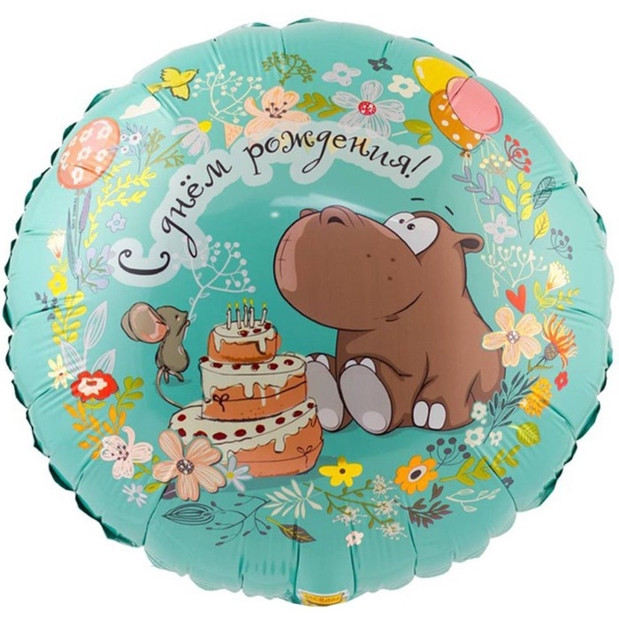 Шар фольгированный 18" «С днём рождения», бегемот с тортом