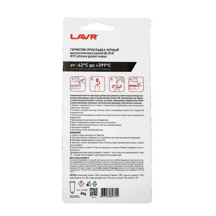 LAVR представляет самый мощный герметик-прокладку для тяжелонагруженных примыкающих узлов и соединений двигателей, КПП. Герметик-прокладка черный высокотемпературный от LAVR полимеризуется за 15 минут и может заменять резиновые, бумажные, металлические прокладки, уплотнители и сальники. Быстрый и сильный состав имеет диапазон рабочих температур от -62°С до +399°С и подходит для герметизации самых важных узлов. Он не содержит кислот и растворителей, что обеспечивает применение в электрических соединениях и датчиках.