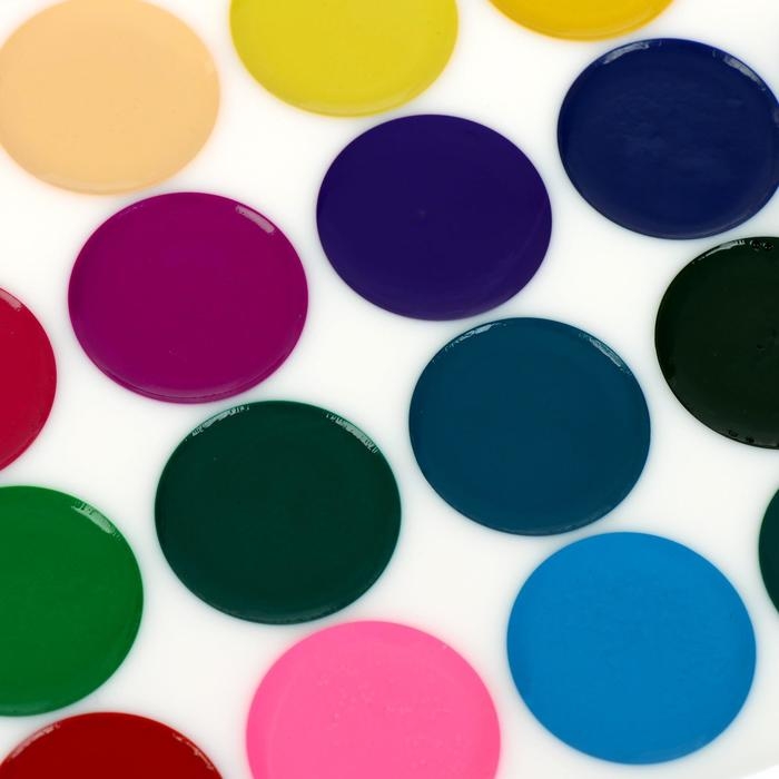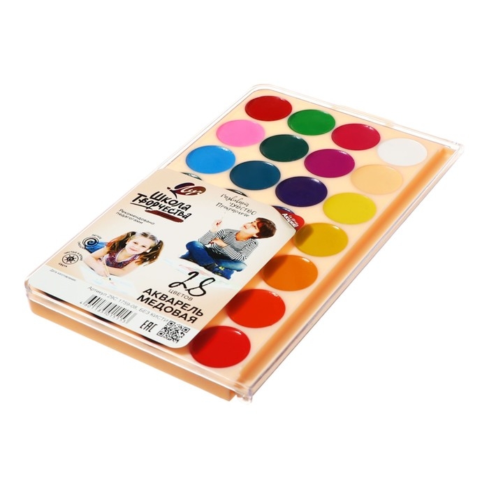 Медовая акварель изготовленная по классической рецептуре с яркими и чистыми цветами. Краска в подложке расположена группами: холодные-тёплые оттенки. Прекрасно размывается и разносится по поверхности бумаги, имея прозрачную основу без вкраплений. Краски смешиваются между собой, сохраняя насыщенность цвета. Краска легко смывается с рук и одежды.