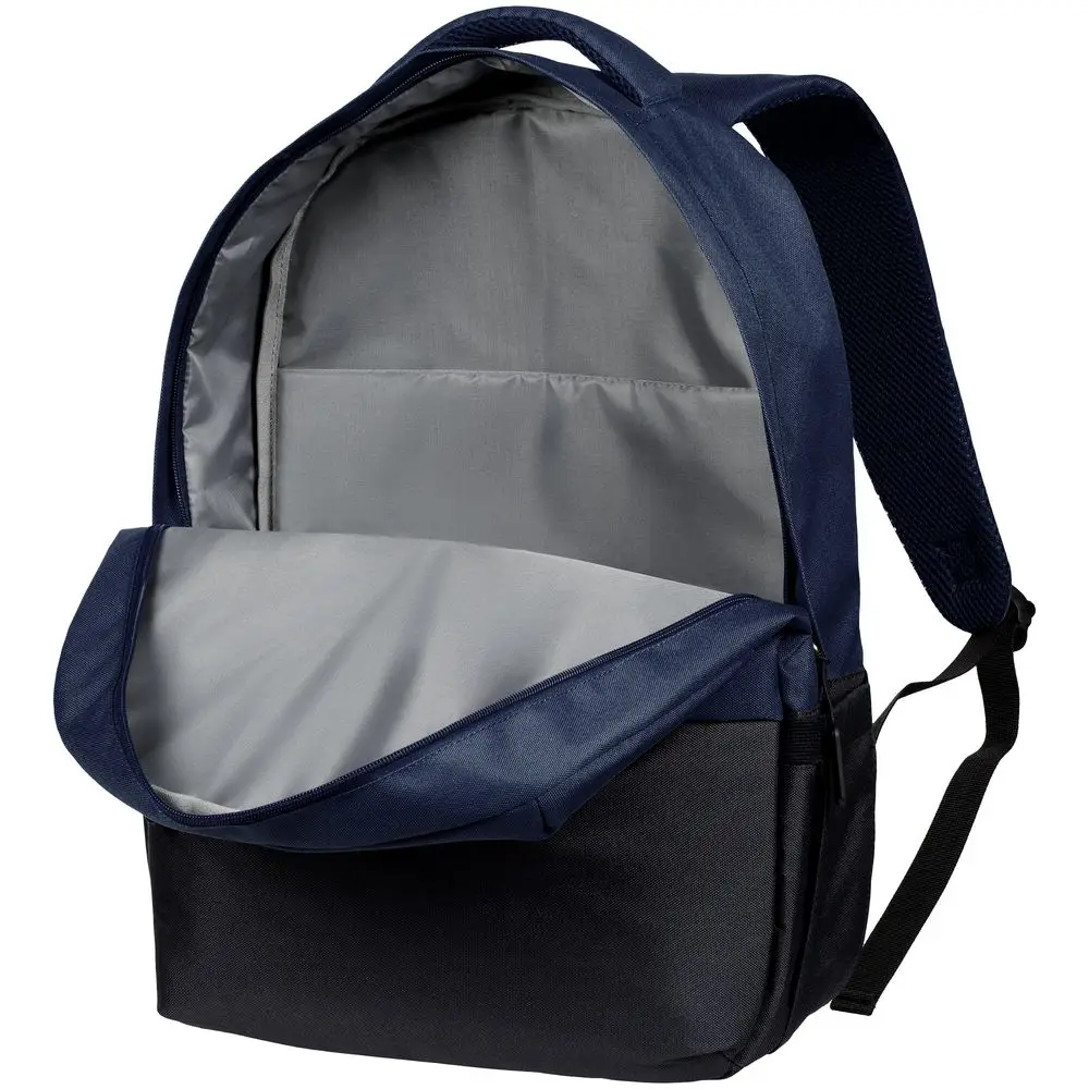 Двухцветное исполнение с темным низом и более светлым верхом, с одной стороны, помогает рюкзаку дольше сохранять опрятный внешний вид, а с другой — позволяет активнее и контрастнее выделить логотип компании.