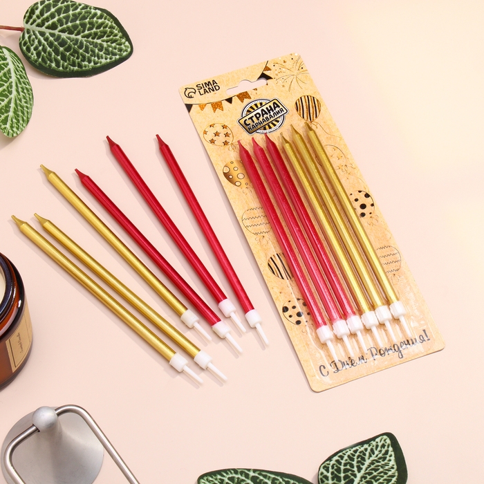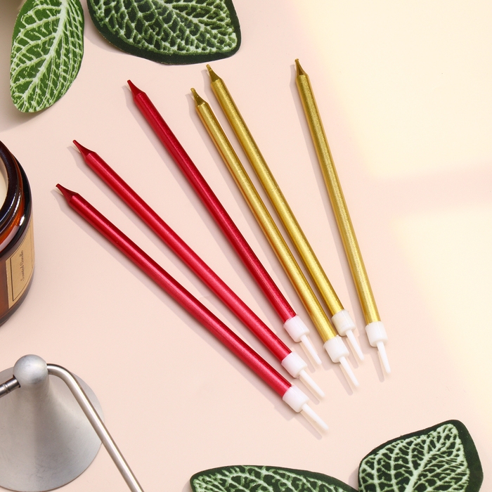 Свечи в торт "Ройс", 6 шт, высокие, 13 см, бордовые и золотые