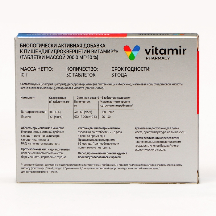 Состав: Инулин, дигидрокверцетин, магния стеарат (агент антислеживающий), стеариновая кислота (стабилизатор).