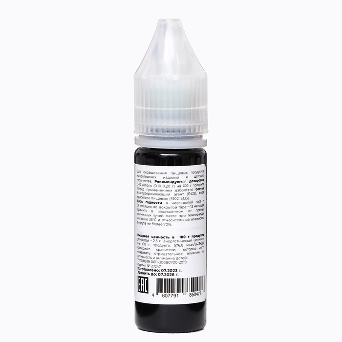 Область применения: для окрашивания продуктов питания и различных кондитерских изделий (теста, мастики, айсинга, марципана, крема и так далее), а также для детского творчества (мыловарение, слаймы).