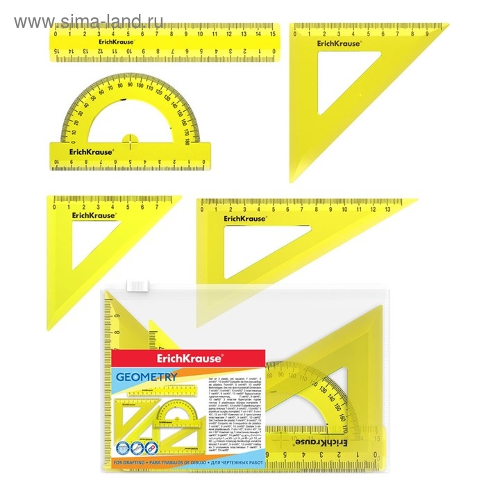 Набор геометрический малый ErichKrause Neon (угольник- 3 штуки, линейка - 15 см, транспортир), жёлтый