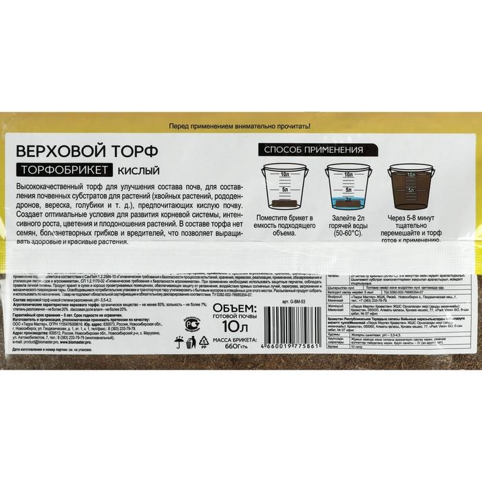 Торфобрикет Верховой торф кислый, 10 л. "БиоМастер"