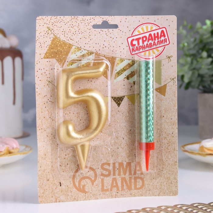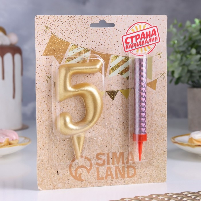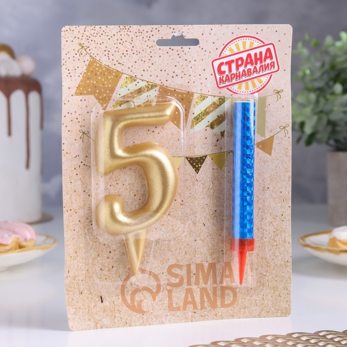 Набор Свеча для торта цифра 5 Гигант, золотая, с фонтаном, 9,5 см