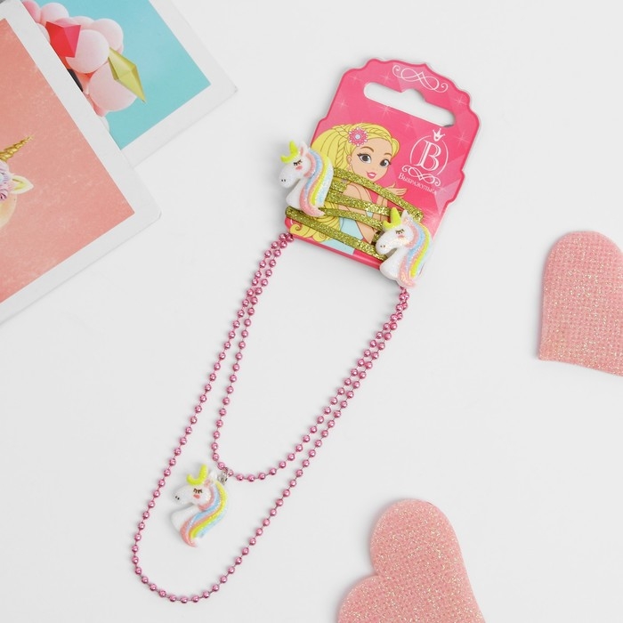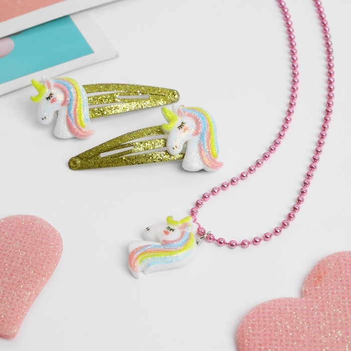 Комплект детский 2 предмета: 2 заколки, кулон «Единороги», цвет розово-золотой