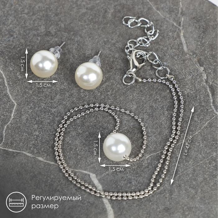 Гарнитур 2 предмета: серьги, кулон «Жемчужина моря» бусины, цвет белый в серебре, 45 см