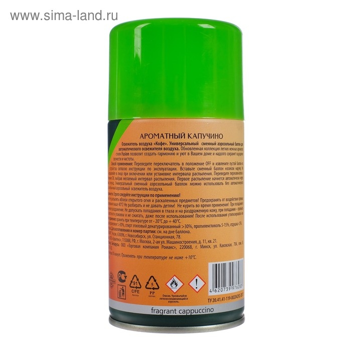 Универсальный сменный аэрозольный баллон для автоматического освежителя воздуха. Обновленная коллекция легкий нежных ароматов позволит создать гармонию и уют в Вашем доме и надолго сохраняет ощущение свежести и чистоты. Создает атмосферу свежести, чистоты и уюта, наполняя дом ароматом свежего ароматного кофе. Заменяет свечи, арома-лампы, саше, диффузоры. Для ванной комнаты и туалета более современный аналог освежителя воздуха. Для гостиной, детской или спальни освежает и увлажняет воздух, создает комфортный уровень ароматизации помещения. Для кухни нейтрализует запахи жарки, некоторых продуктов (лук, чеснок, рыба). Высокая концентрация и активная формула баллон действует до 60 дней.