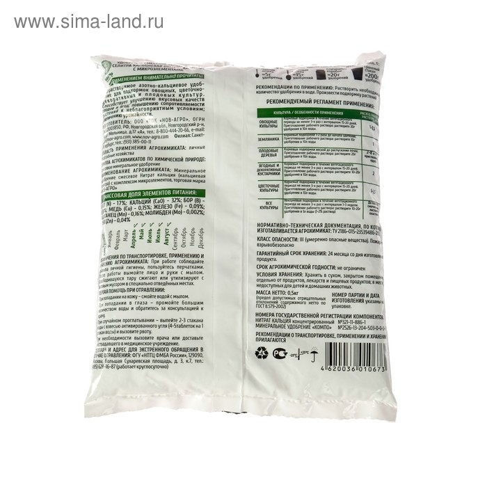 Селитра кальциевая (нитрат кальция) с комплексом микроэлементов - водорастворимое удобрение для подкормок овощных, цветочно-декоративных и плодовых культур. Способствует улучшению вкусовых качеств плодов и ягод; повышению сопротивляемости растений к неблагоприятным условиям; увеличению урожайности.