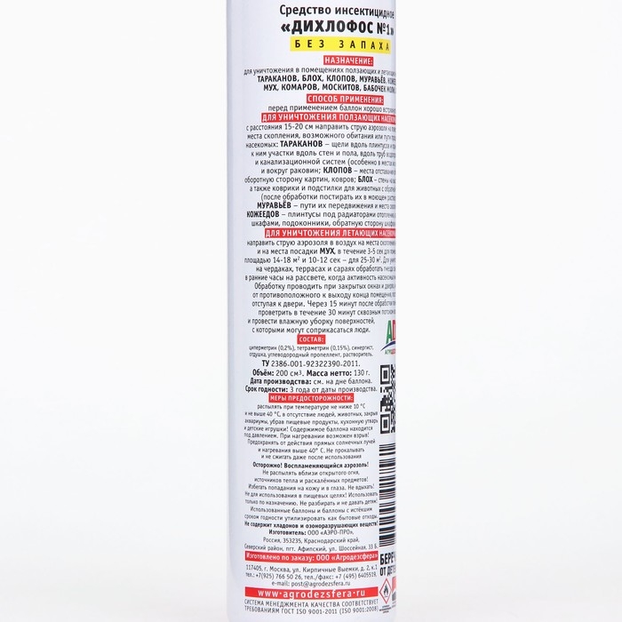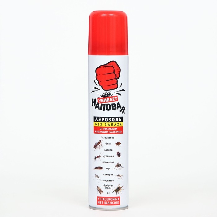 Средство инсектицидное Дихлофос №1 без запаха НАПОВАЛ - это инсектицидное средство для уничтожения в помещениях летающих и ползающих насекомых: тараканов, блох, клопов, муравьев, кожеедов, мух, комаров, москитов, бабочек моли, ос. Способ применения: Перед применением баллон хорошо встряхнуть. Для уничтожения ползающих насекомых с расстояния 15-20 см направить струю аэрозоля на поверхности- места скопления, возможного обитания или пути продвижения насекомых: тараканов- щели вдоль плинтусов и прилегающие к ним участки вдоль стен и пола, вдоль труб водопроводной и канализационной систем; клопов- места отставания обоев, обратную сторону картин, ковров; блох- стены на высоту до 1м, а так-же коврики и подстилки для животных с обратной стороны (после обработки постирать их в моющем растворе!); муравьев- пути передвижения и места скопления; кожеедов- плинтусы под радиаторами отопления, кроватями, шкафами, подоконники, обратную сторону шкафов и полок. Для уничтожения летающих насекомых: направить струю аэрозоля в воздух на места скопления насекомых и на места посадки мух в течение 3-5 сек. для помещений площадью 14-18 кв.м. и 10-12 сек. для помещений 25-30кв.м. Для уничтожения ос на чердаках, террасах и сараях обработать гнезда снаружи в ранние часы на рассвете, когда когда активность насекомых минимальна.Обработку проводить при закрытых окнах и дверях, через 15 минут помещение проветрить в течение 30 минут сквозным потоком воздуха и провести влажную уборку поверхностей, с которыми могут соприкасаться люди.Составциперметрин 0,2%, тетраметрин 0,15%, синергист, отдушка, углеводородный пропеллент, растворитель